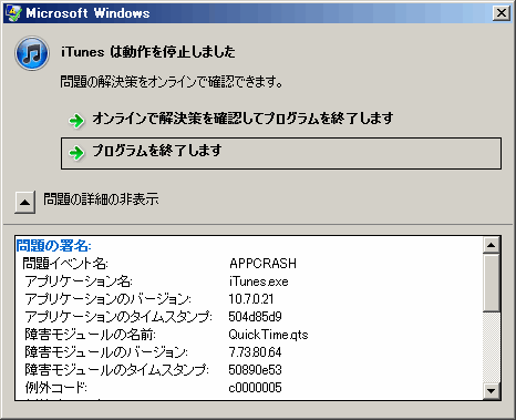 ムービーを再生するとiTunes10.7が落ちるエラーの対処
